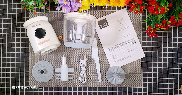 可愛的外觀就不再描述了,先來看一下600ml「MAXCELIA 無線調理秤秤機」全機標配,有調理機主體、600ml玻璃碗,再配上4款工具與刀具,隨機附的一支刮刀、充電線與說明書一本。
