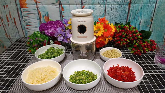 再來將青蔥、辣椒、薑片也一併切成碎末。如果沒有調理機想將這些辛辣食材切成碎末,先不論要花多少時間,光是切蔥、辣椒會讓人流眼淚這點,就夠你受的。