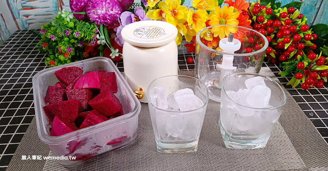 天氣實在是熱到爆炸,拿出冰箱中的水果、冰塊,先來試試切碎刀利不利、馬達強不強。水果放進去、冰塊加進去,輕輕鬆鬆的一杯水果冰沙就完成了,以後想吃冰飲就方便多了。