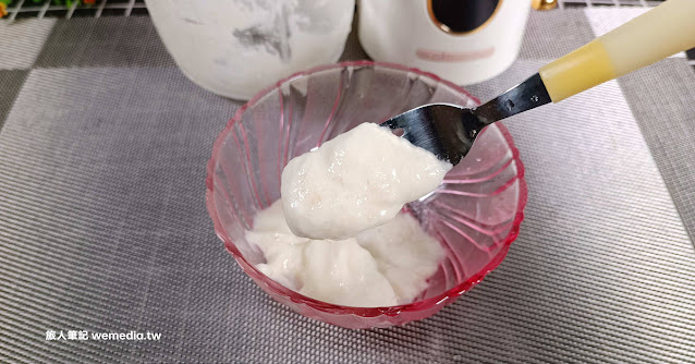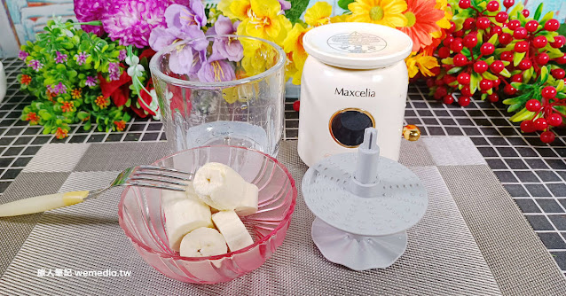 再拿新鮮的香蕉試試看磨泥盤的磨泥效果,磨泥用的磨泥盤要搭配攪拌盤使用,它要裝在攪拌盤上方,共用一個支架使用。而如果是單純使用攪拌盤的話,則可用來打蛋白霜、打奶泡…等,這個改天再來試試。